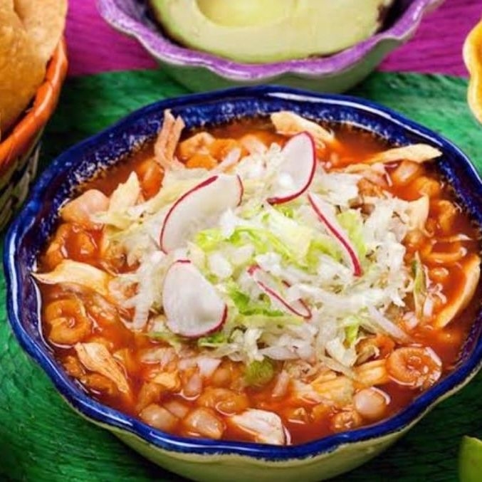 Tradicional pozole rojo estilo mexicano porción chica de pozole.