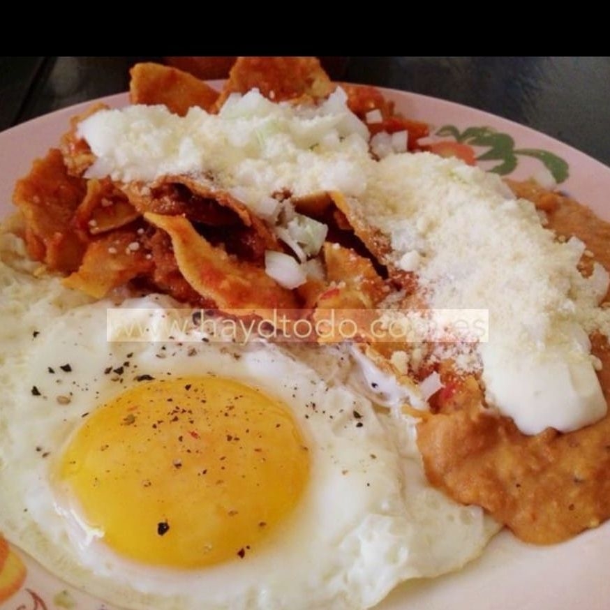 Chilaquiles verdes o rojos con huevo y frijol.