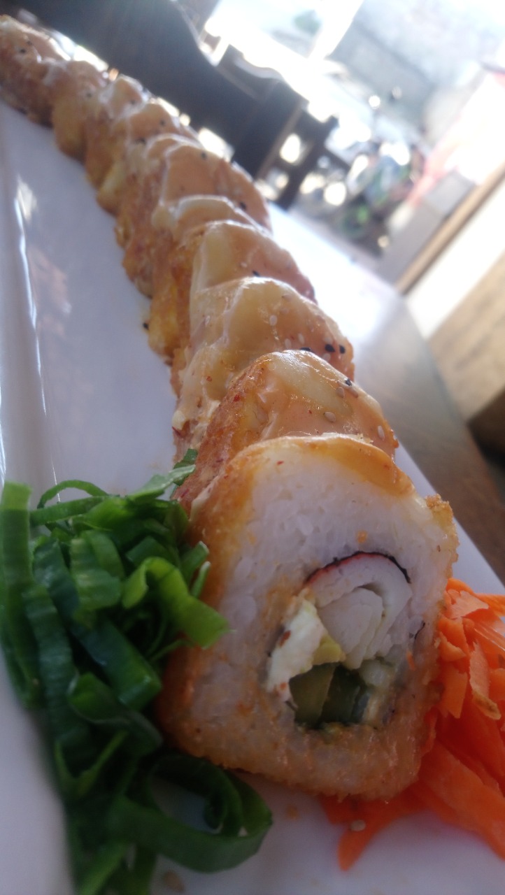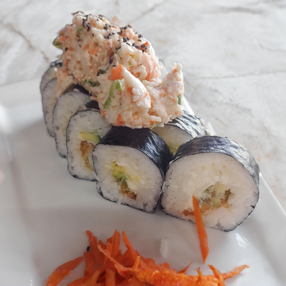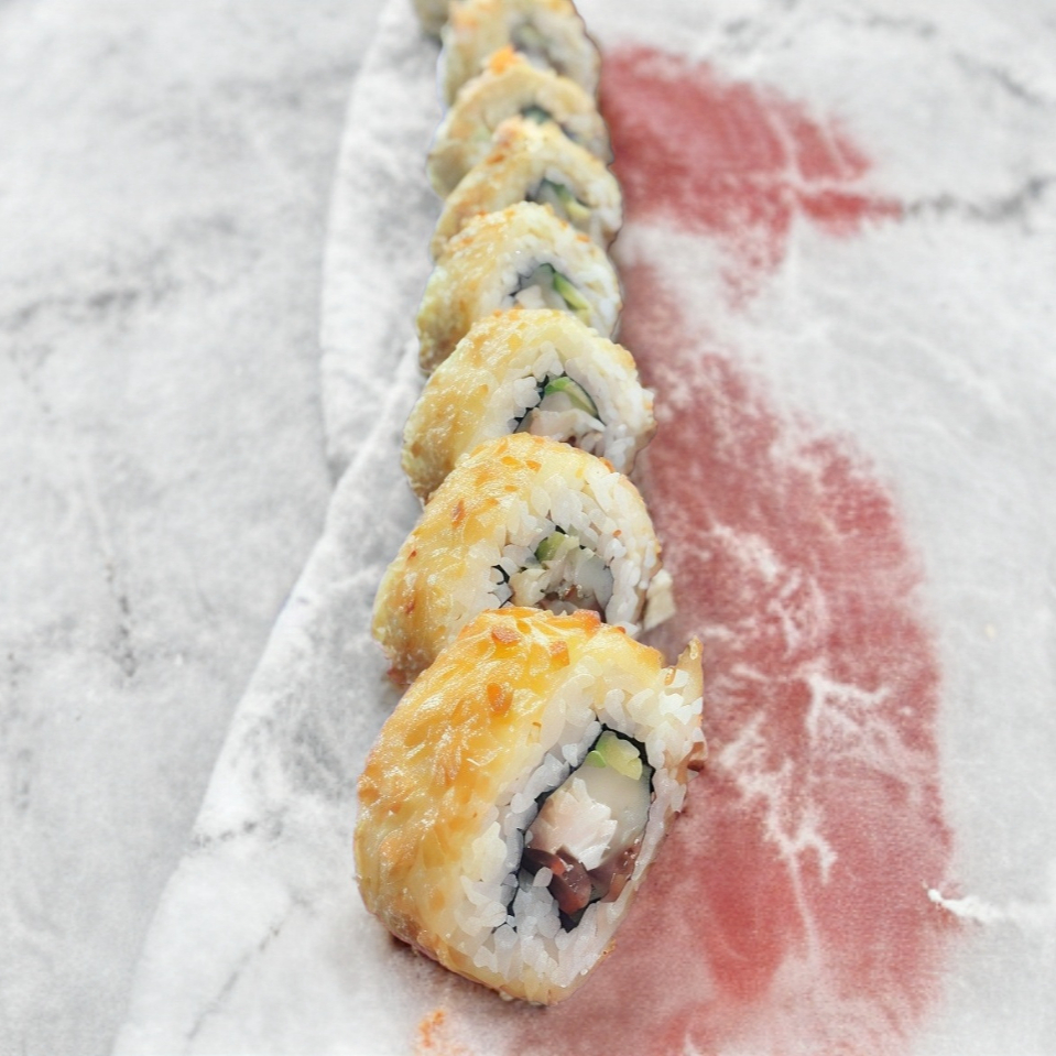 Relleno de surimi, aguacate y queso crema, bañado en harina tempura y frito con un delicioso topping de Tampico