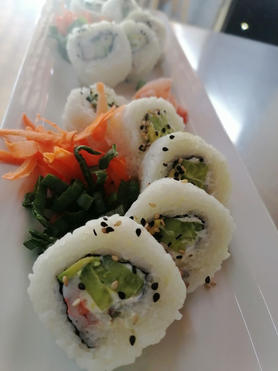 Surimi, queso crema, aguacate, pepinillo, forrado de queso crema.
