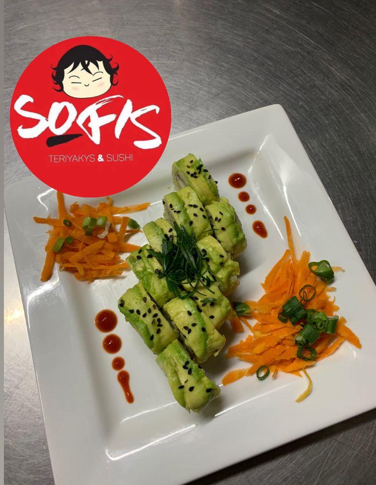Camarón, surimi, queso crema, pepinillo y forrado de aguacate.