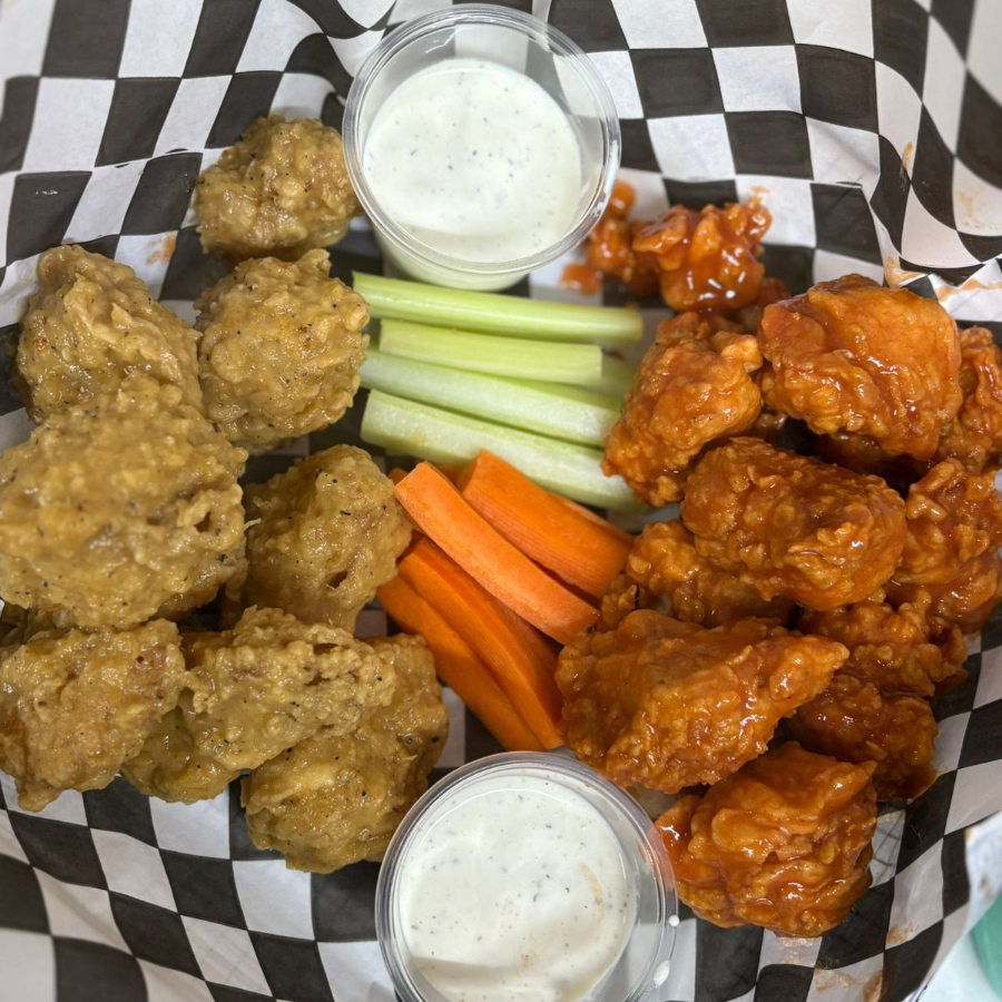 8 piezas de boneless (salsa a elegir), apio y zanahoria, aderezo ranch