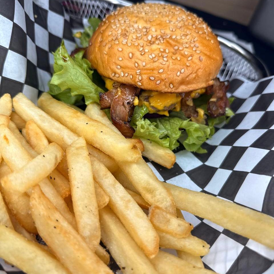 BACON CHEDDAR BURGER CON PAPAS