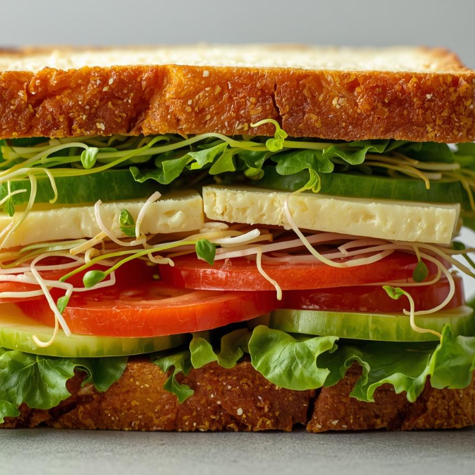 Ingredientes 100 % naturales. Sándwich con pan multigrano, queso panela, lechuga o espinaca, tomate, pepinillo, alfalfa y manzana verde.