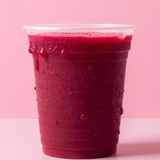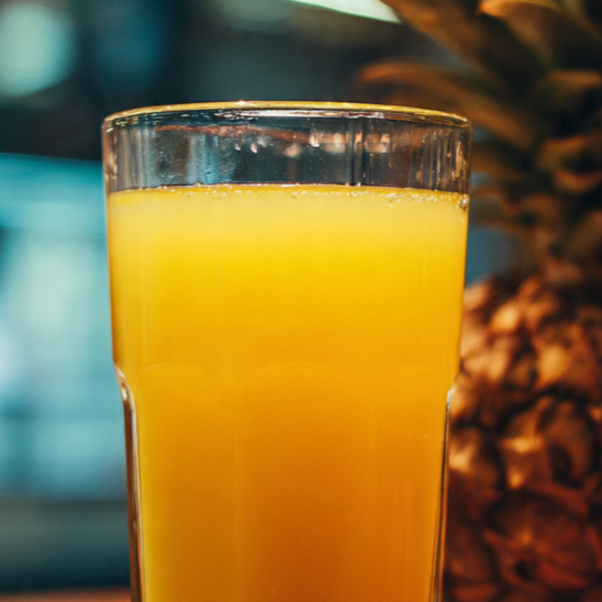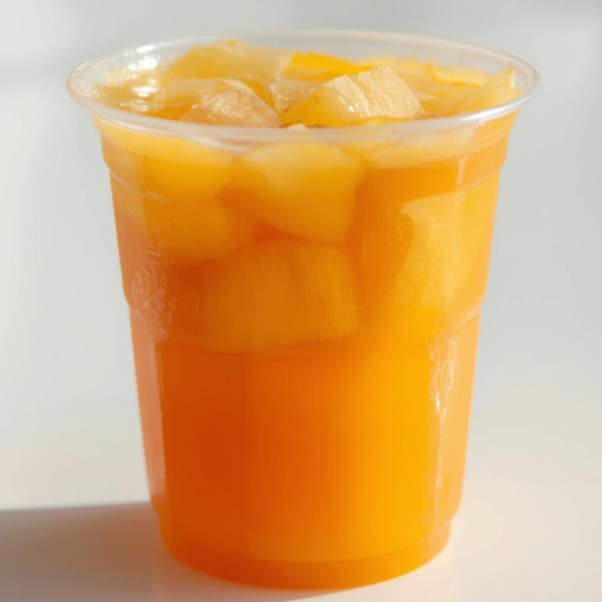 Ingredientes 100 % naturales. Realizado con jugo de naranja, plátano, piña y mango (en temporada). Jugo de 16 onzas y 20 onzas.
