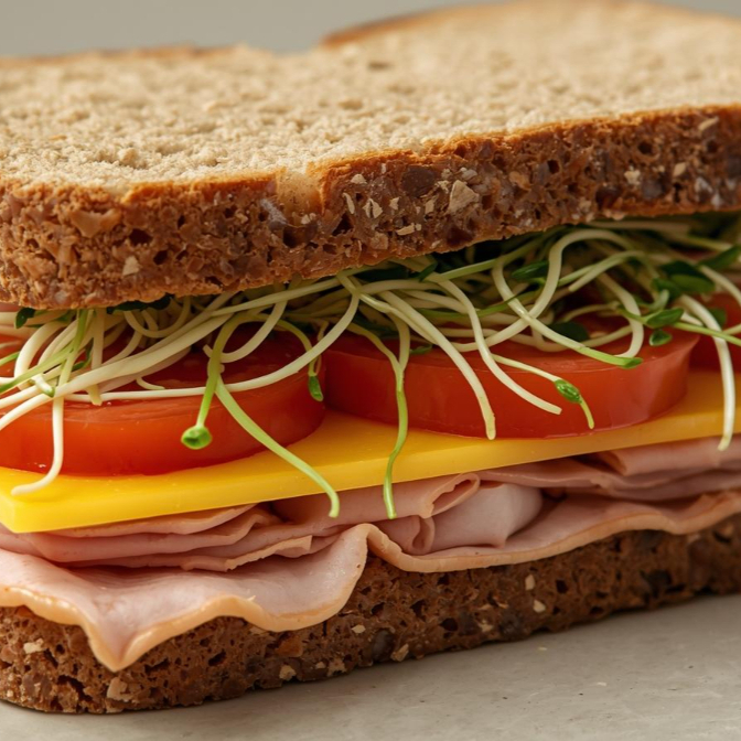 Ingredientes 100 % naturales. Sándwich con pan multigrano, jamón, queso amarillo, lechuga o espinaca, tomate y alfalfa.