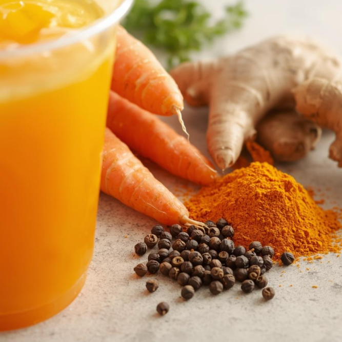 Ingredientes 100 % naturales. Jugo de naranja, zanahoria, cúrcuma, pimienta negra y jengibre. Presentación en 16 y 20 onzas.