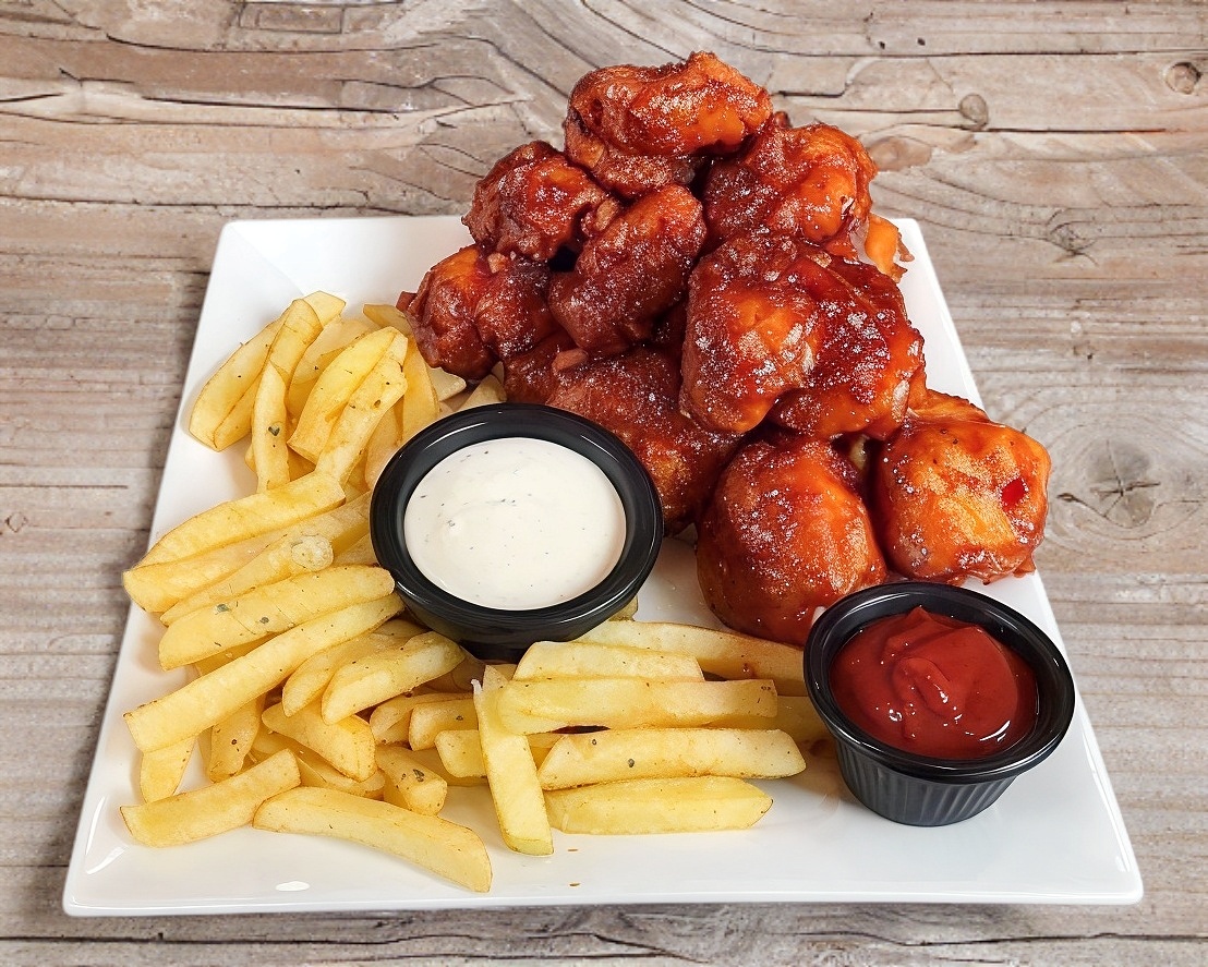 1000 gramos boneles pollo frito bañaando en salsa ala aleación