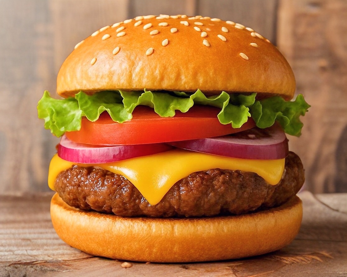 Hamburgesa de carne de pollo tomate, lechuga, cebolla