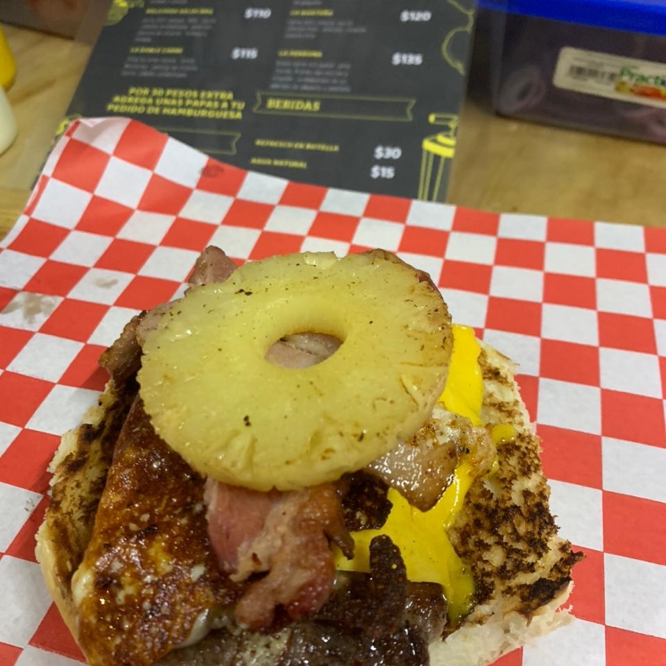 Doble Carne con queso, piña, tocino, frijoles con chorizo y chipotle, acompañado de un aderezo de jalapeño y pepinillo.