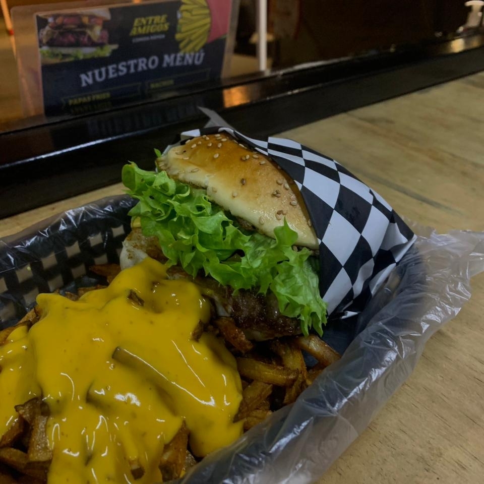 carne 100% natural, tocino, chorizo, frijol, aderezo chipotle, cebolla frita.