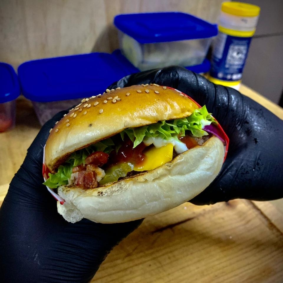 carne 100% natural, tocino, cebolla frita, queso americano, lechuga, tomate y cebolla.