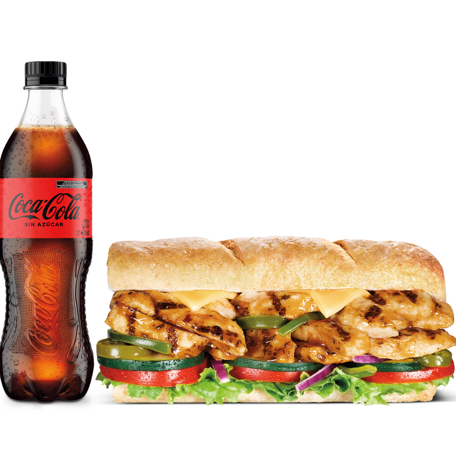 Pan integral con tiras de pechuga de pollo estilo teriyaki, doble porción de queso americano, cebollitas crujientes, lechuga, jitomates, pimientos verdes y aderezo de cebolla dulce, más papas o galleta y bebida.