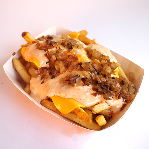 Papas fritas con queso amarillo derretido, aderezo súper, cebolla caramelizada