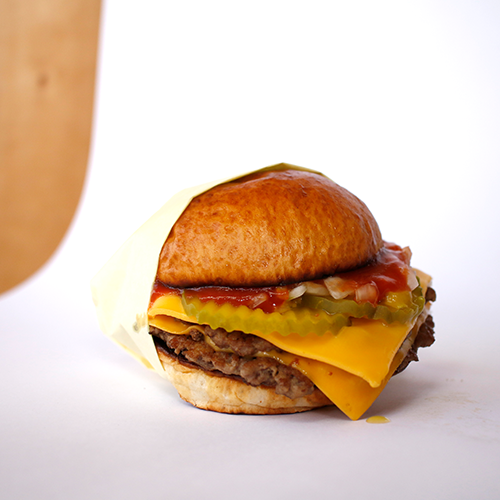Una carne smash con queso amarillo, catsup y mostaza.