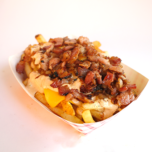 Papas fritas con queso amarillo derretido, tocino, aderezo súper y cebolla caramelizada