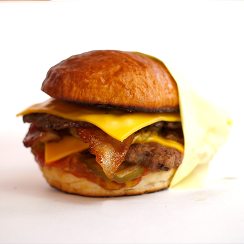 Smashburger doble, tocino, queso americano, cebolla asada, pepinillos, ketchup, mostaza