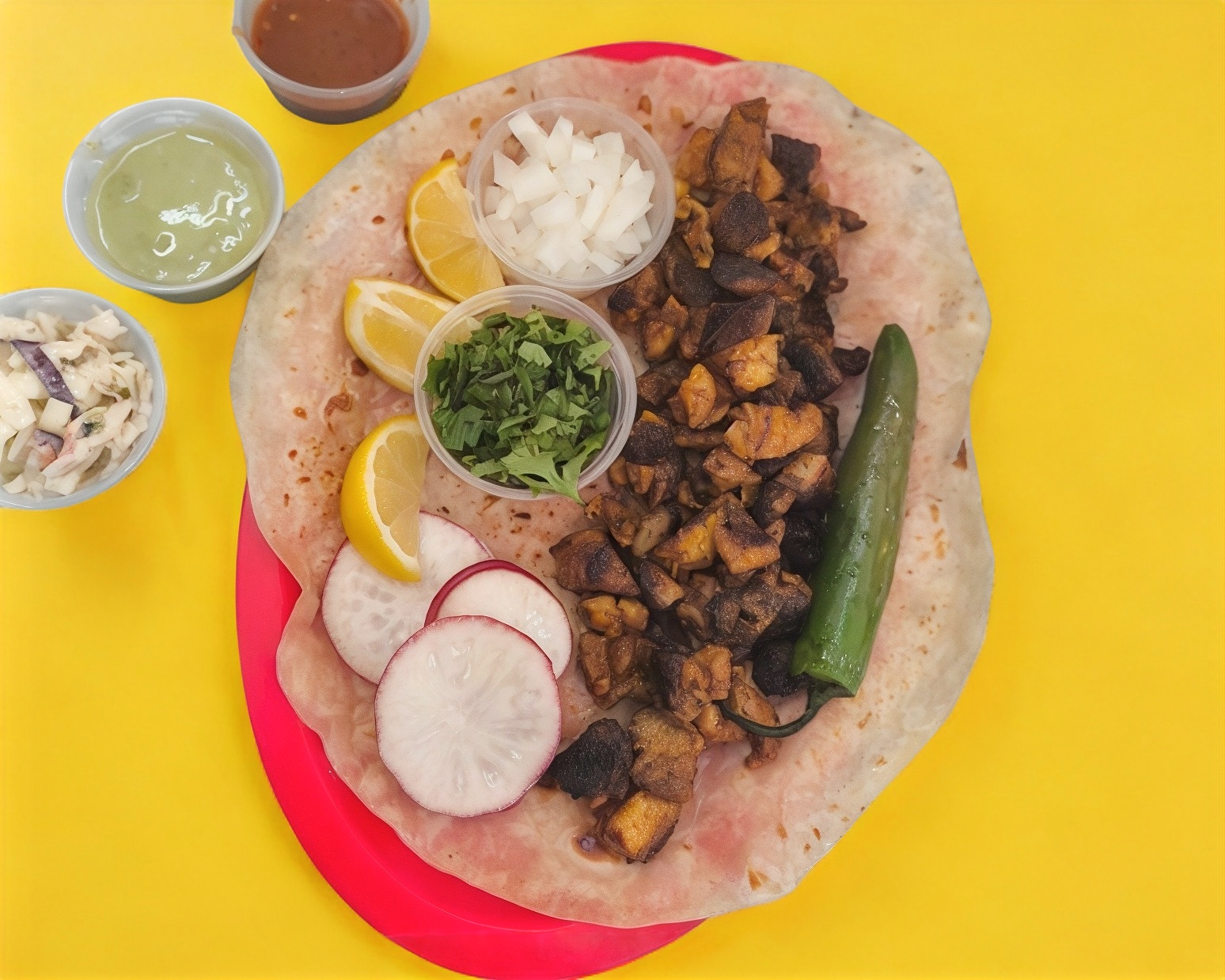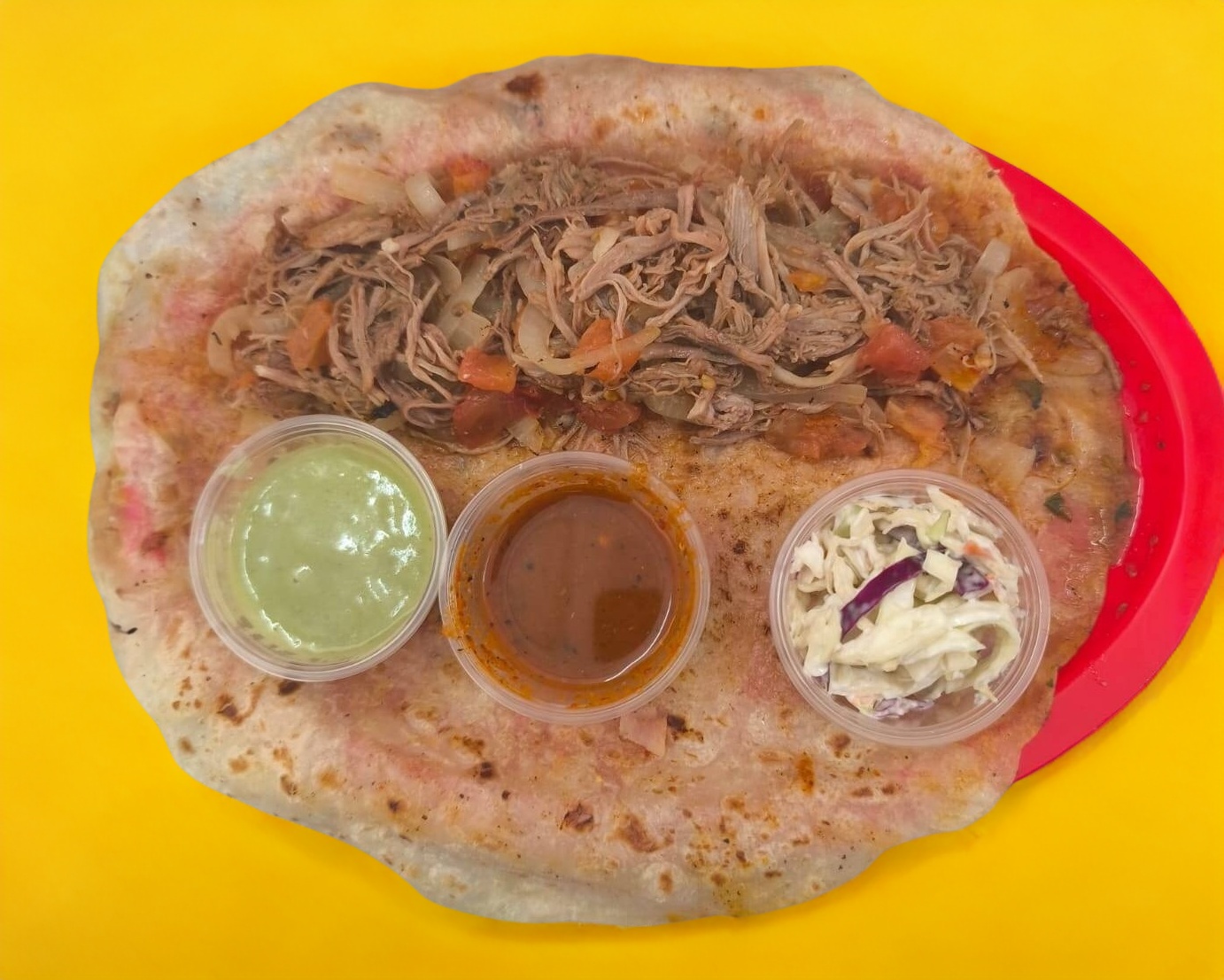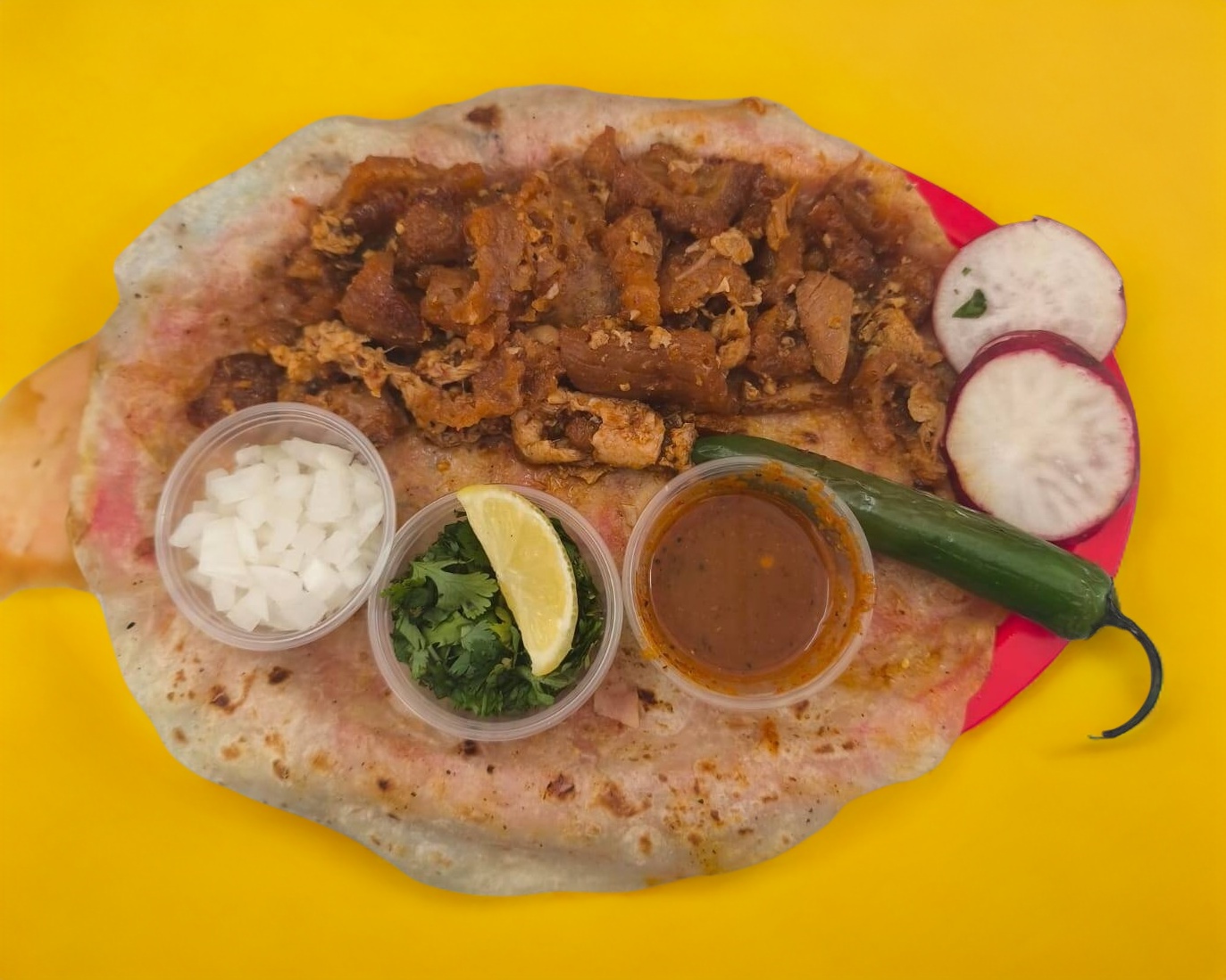 Tortilla de harina grande, carne de puerco marinada, fríjol y sus salsas aparté.