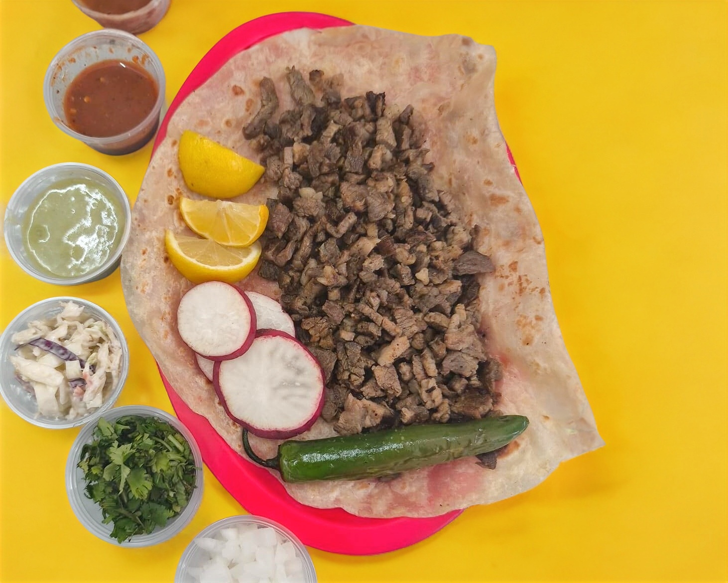 Tortilla de harina grande, carne Asada al carbón, fríjol y sus salsas aparté.