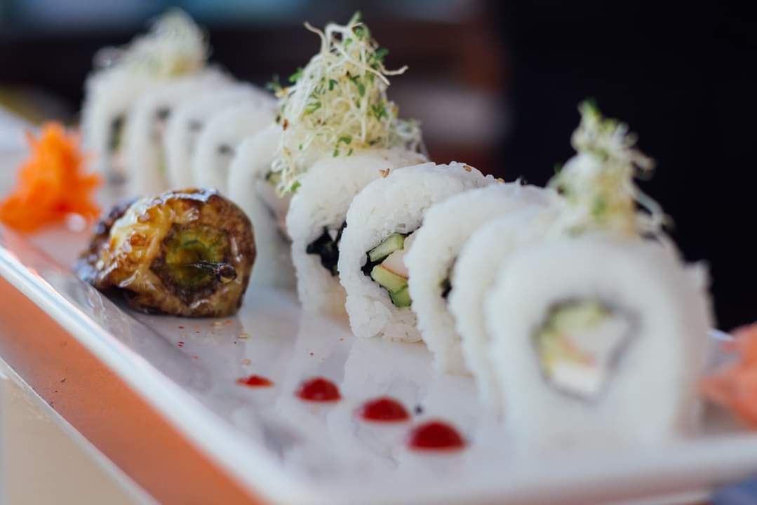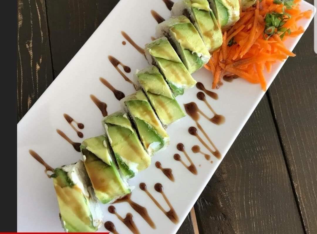 Philadelphia, aguacate, pepino, camarón, surimi por encima tampico y aguacate.