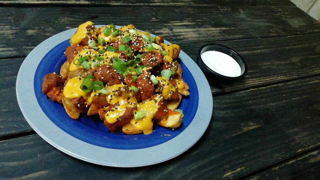 Philadelphia, res, pollo. Por encima queso chihuahua, queso americano.