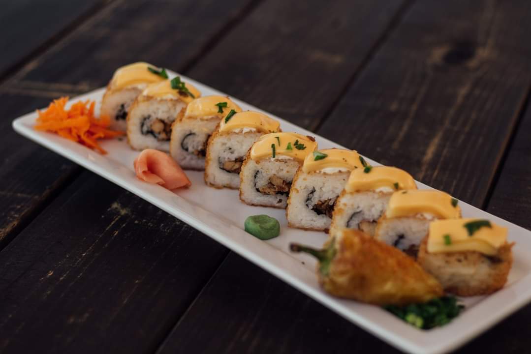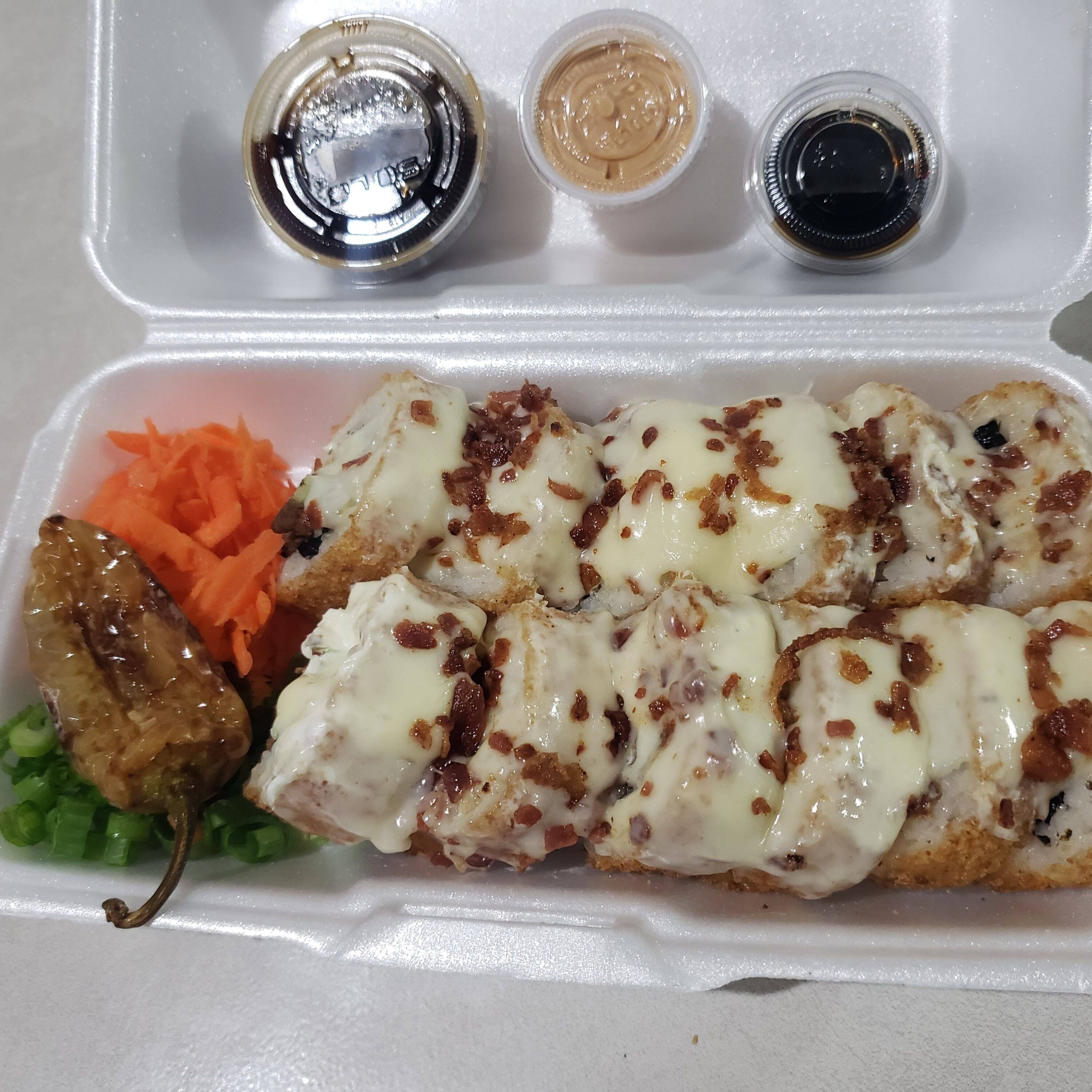 Philadelphia, res, pollo, pepino y aguacate. Cubierto con philadelphia, queso chihuahua y tocino.