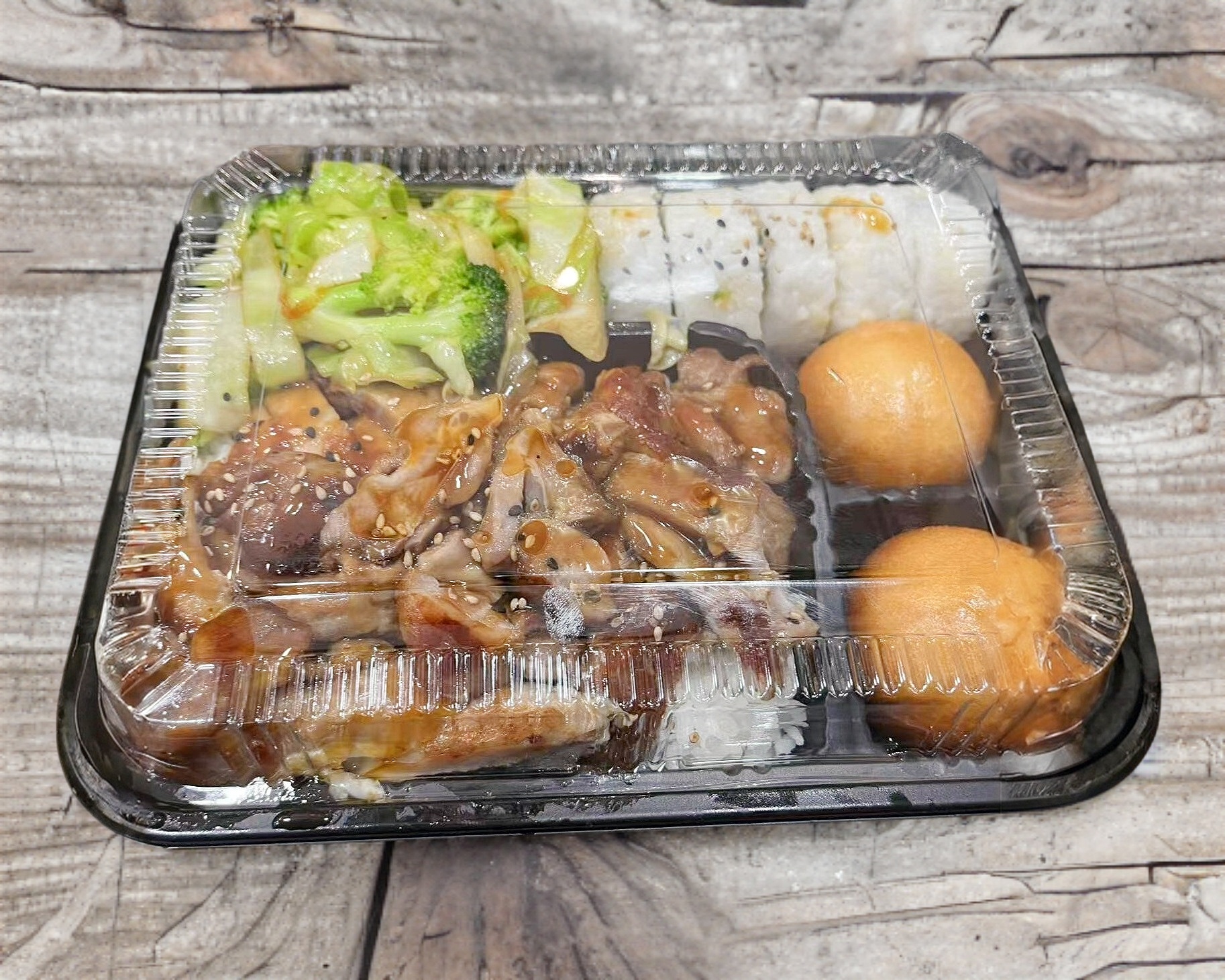 Teriyaki pollo y camarón,Arroz blanco,pan dorado,1/2 roll California,verdura cocina