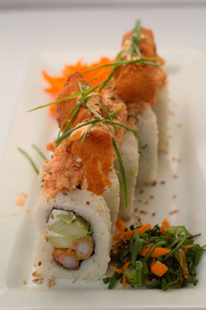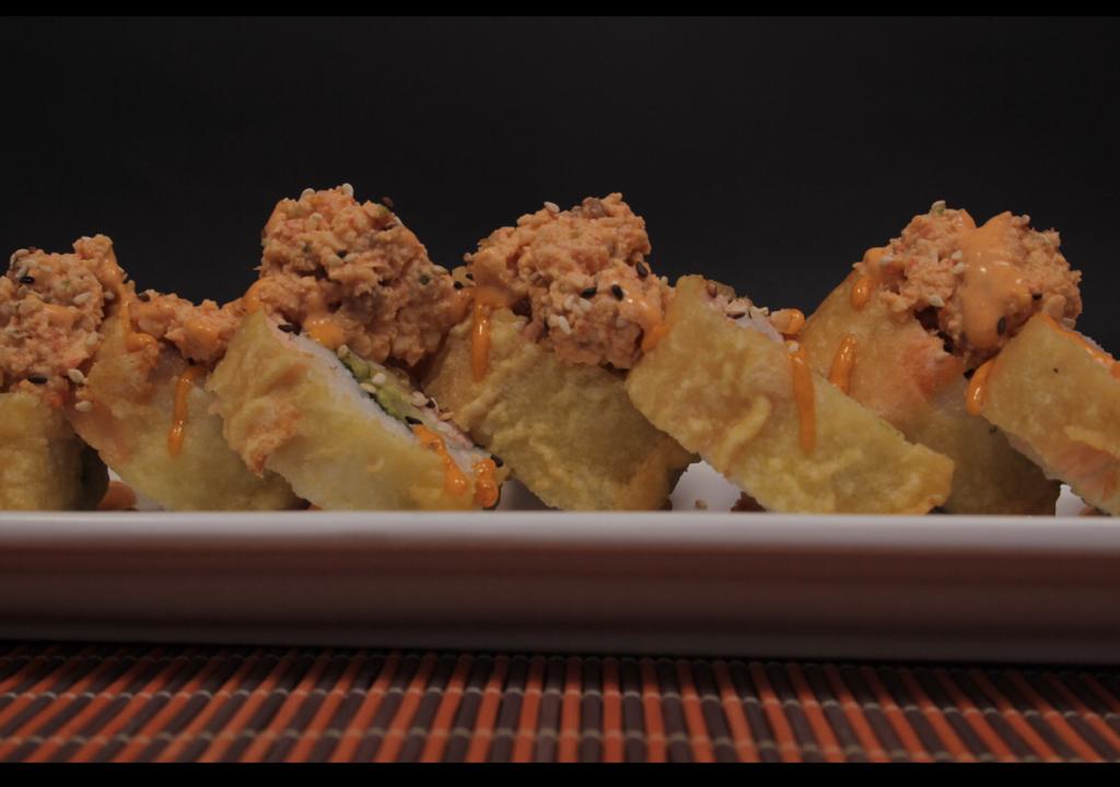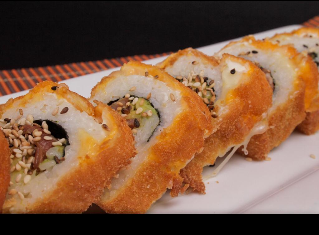 cangrejo,aguacate y queso philadelphia. empanizado acompañado con topping de tampico