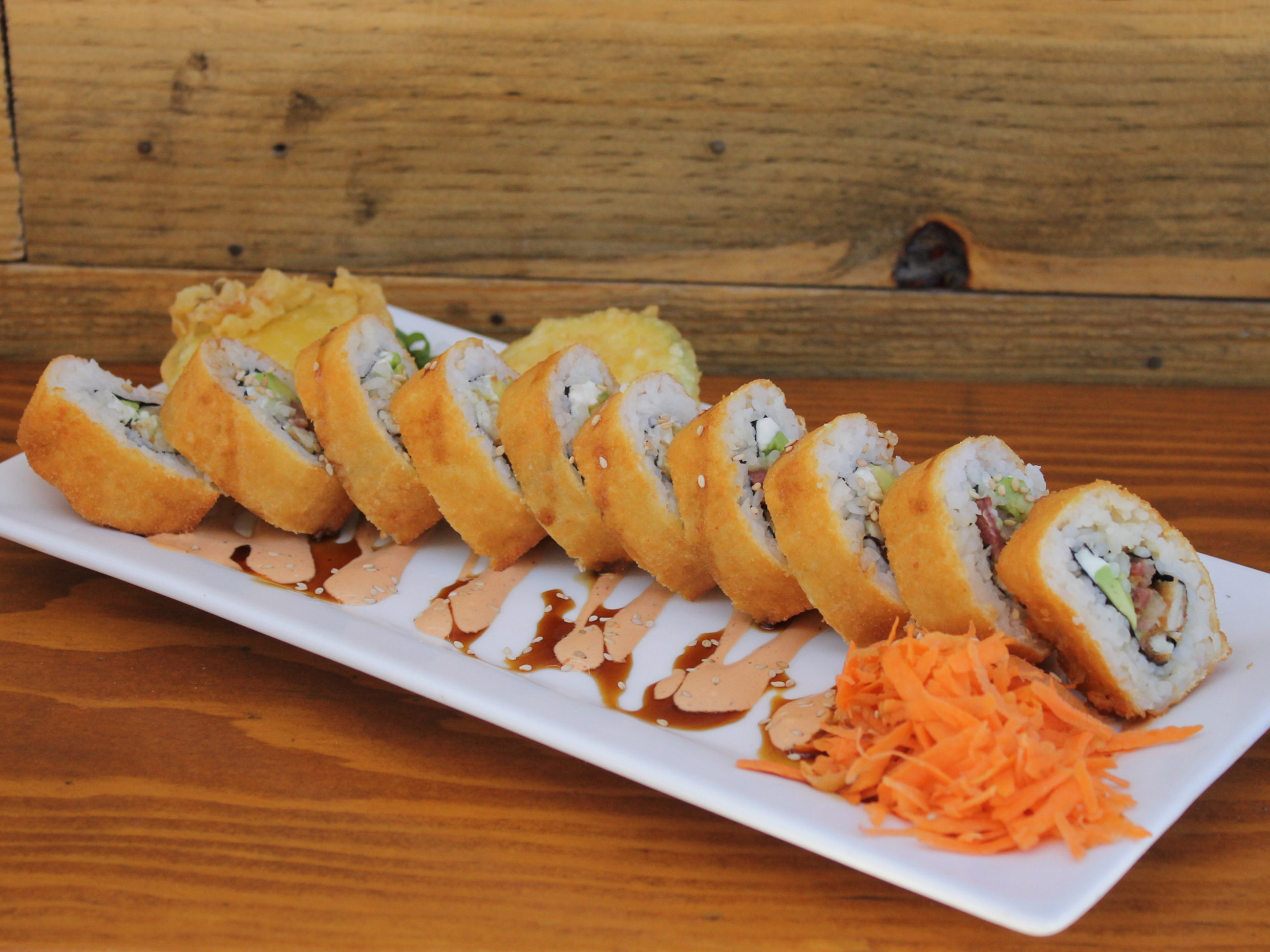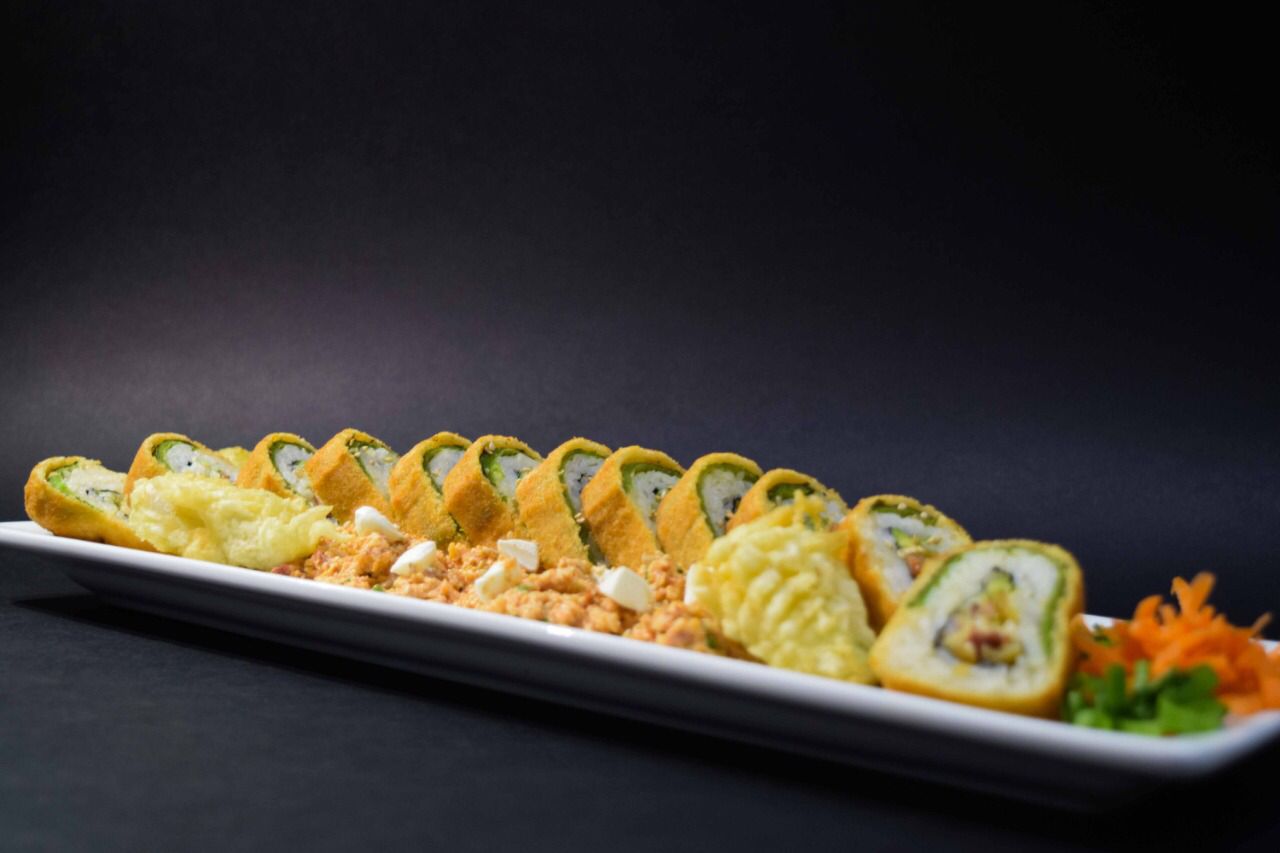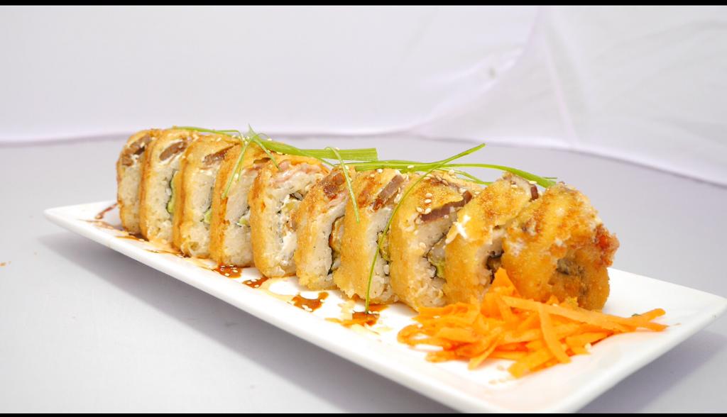Camarón tempura, pollo, tocino, aguacate y queso crema empanizado y con toping de Tampico