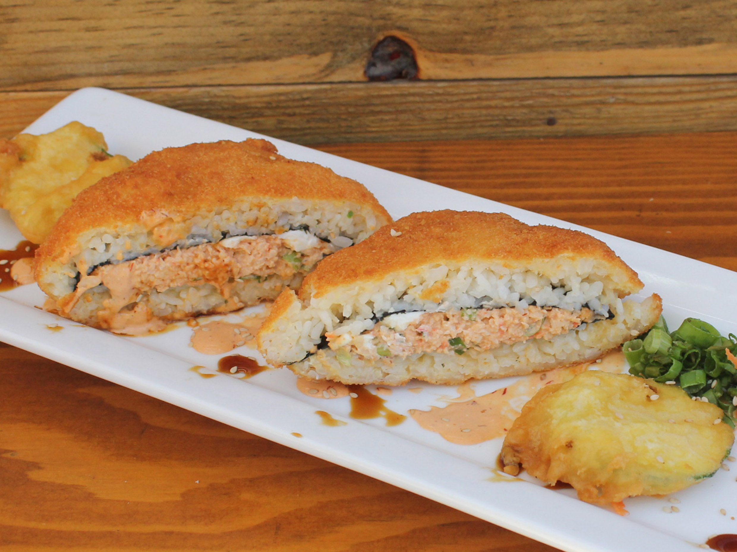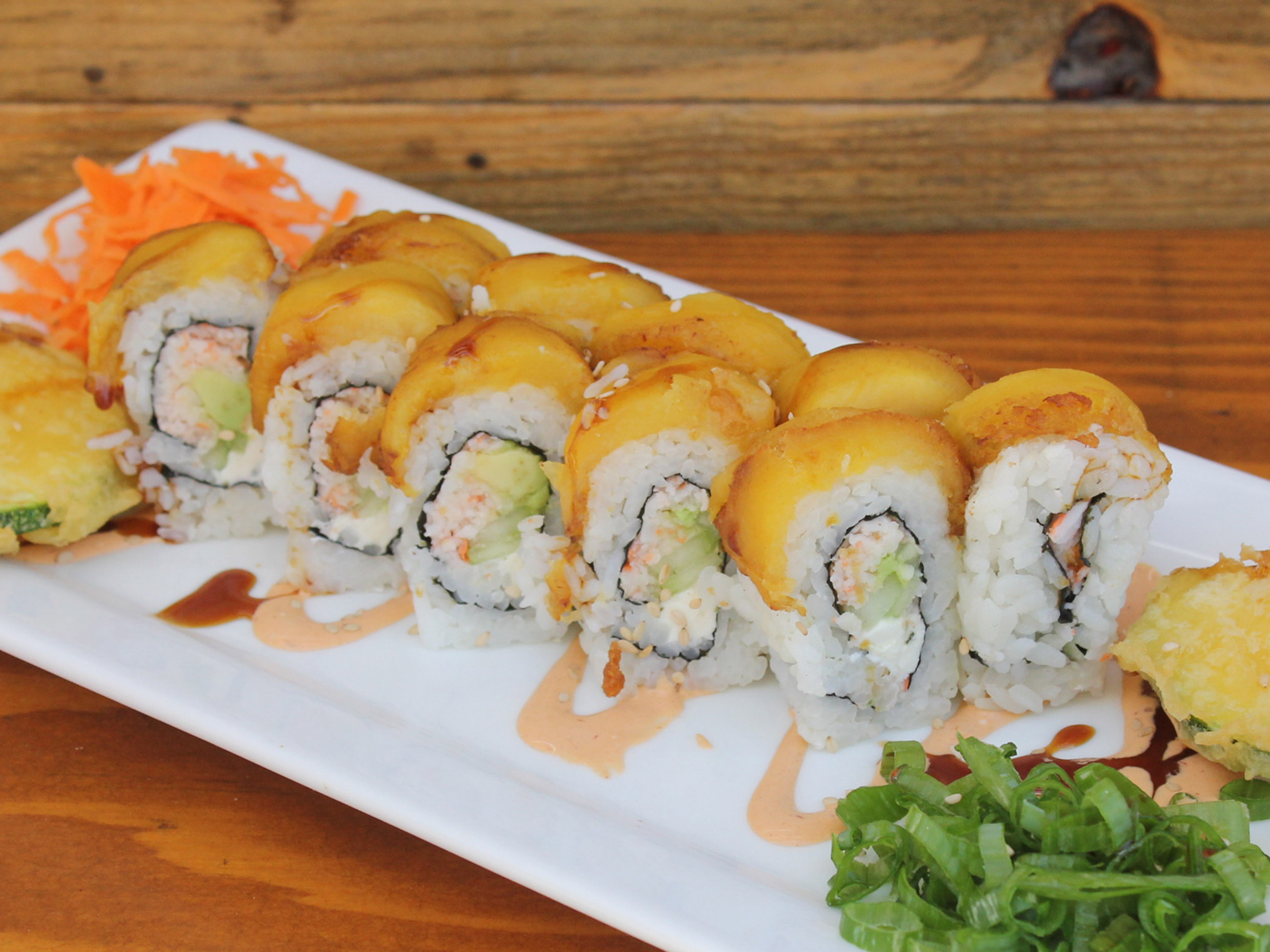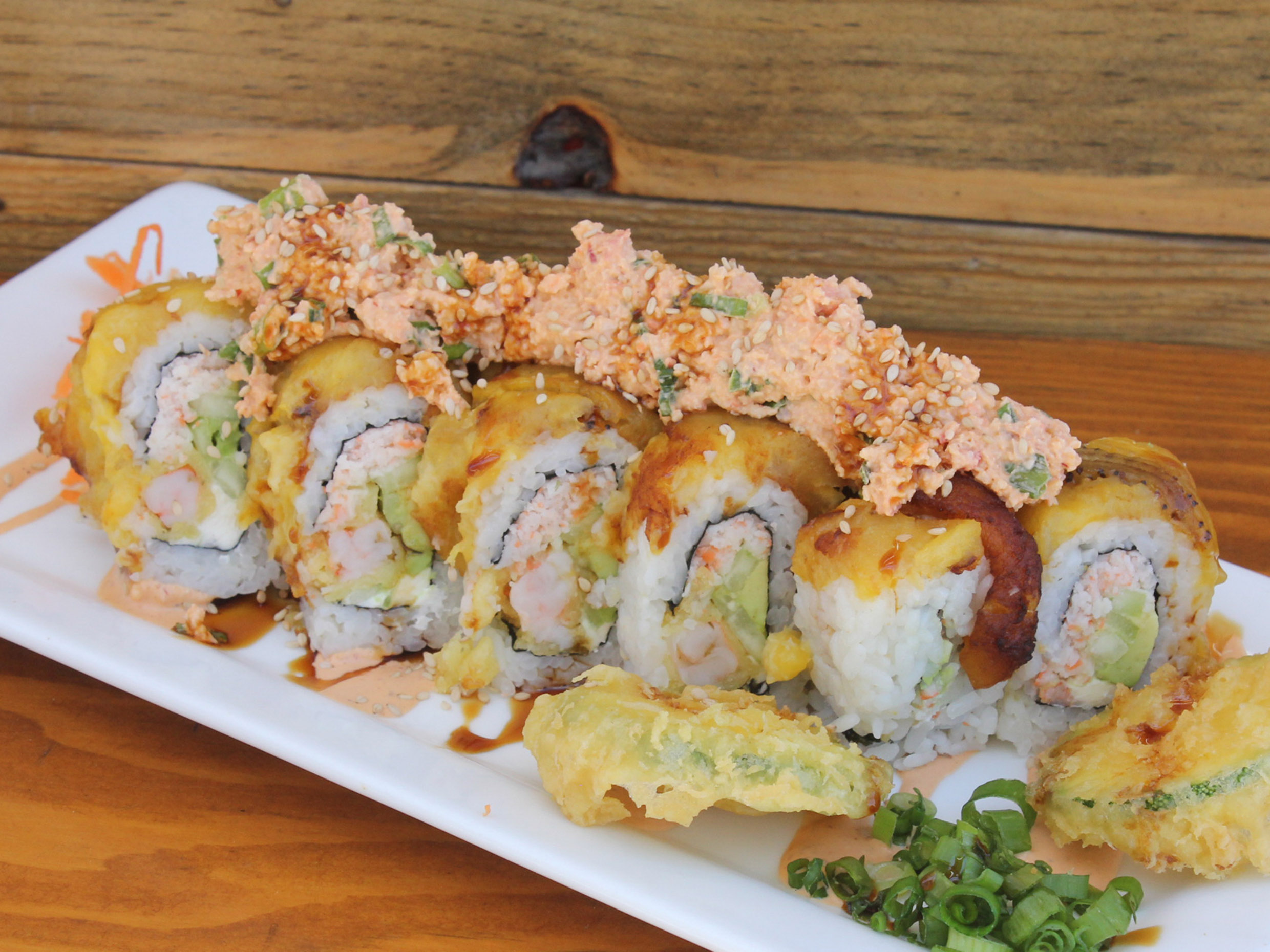 Camarón tempura, pollo, tocino, aguacate y queso crema empanizado y con toping de Tampico