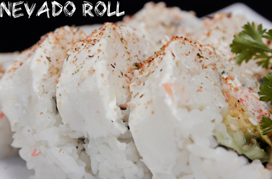 camaron,cangrejo, aguacate, queso philadelphia. empanizado con alga naminori, acompañado de tampico.