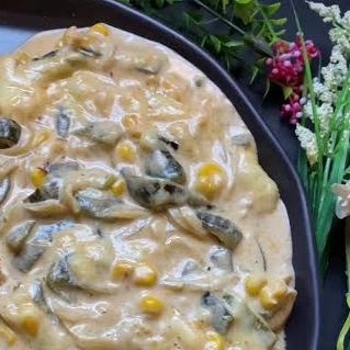 En charola de 8x8. Rajas de chile pasilla con papa,cebolla y chipotle, con su respectivo arroz y frijol acompañado de tortillas de maiz y la salsa de la casa aparte + agua de jamaica en vaso de 12 Oz