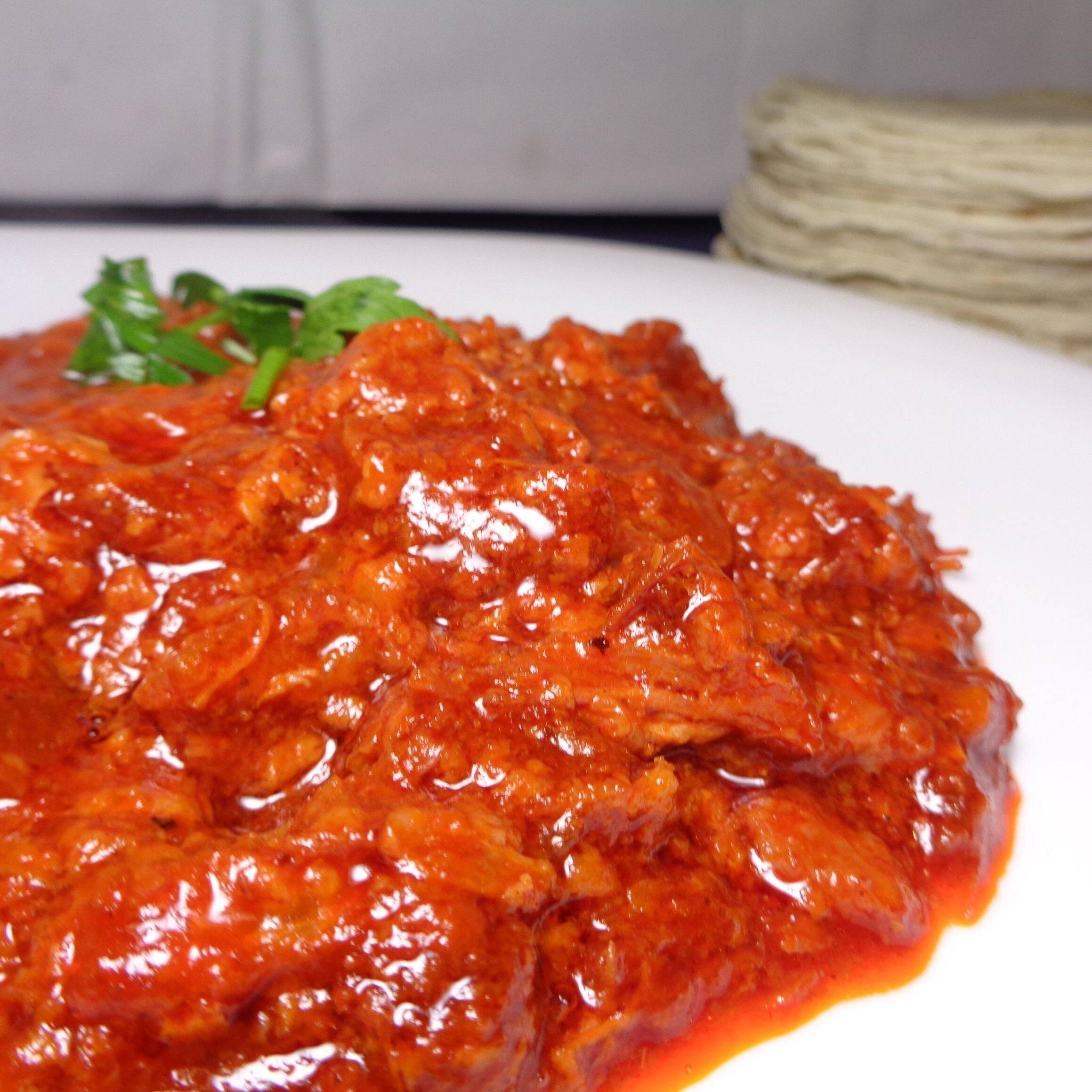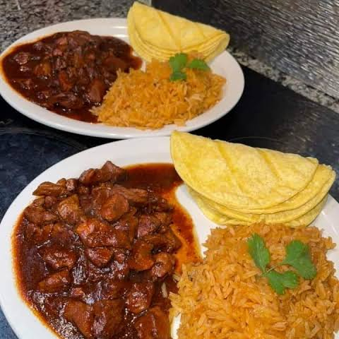 carne de puerco en adobo, endoble tortillas de maiz acompañado de arroz y frijol, con su respectiva verdura y salsa de la casa aparte