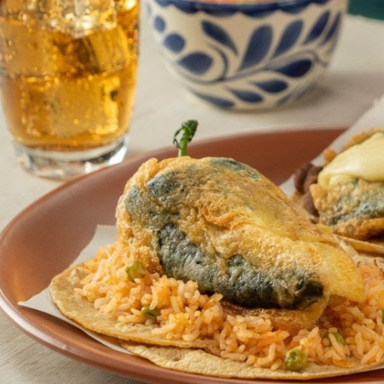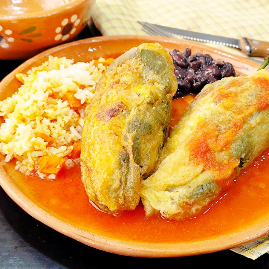 En charola de 8x8. Dos chiles rellenos de queso monterrey especial, encima de unas ricas rajas enchipotladas, con su respectivo arroz y frijol acompañado de tortillas de maiz y la salsa de la casa aparte + agua de jamaica en vaso de 12 Oz