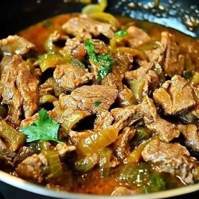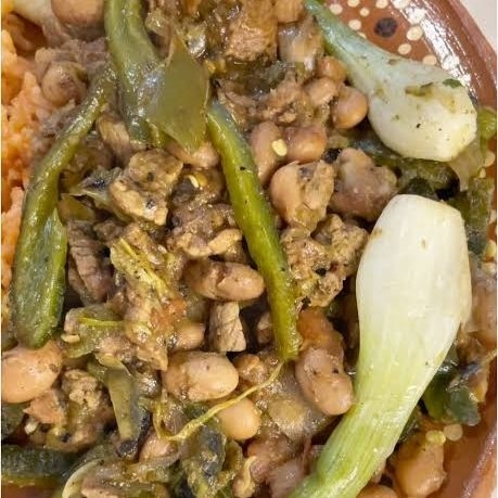 En charola de 8x8. Carne de res con cebolla cambray en salsa de chiles tatemados, con su respectivo arroz y frijol acompañado de tortillas de maiz y la salsa de la casa aparte + agua de jamaica en vaso de 12 Oz