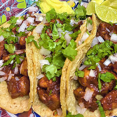 taco de carne de res con cebolla cambray en salsa de chiles tatemados, en doble tortilla de maiz, acompañado con arroz y frijol, con su respectiva salsa de la casa aparte