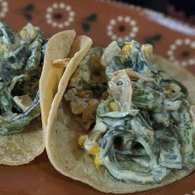 taco de rajas de chile pasilla con papa,cebolla y chipotle, en doble tortilla de maiz, acompañado con arroz y frijol, con su respectiva salsa de la casa aparte
