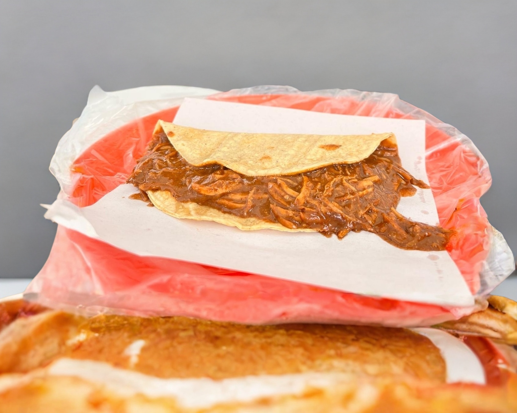 Taco de tortilla de maíz con pechuga de pollo en mole. Puede ir acompañado de arroz o frijolitos.