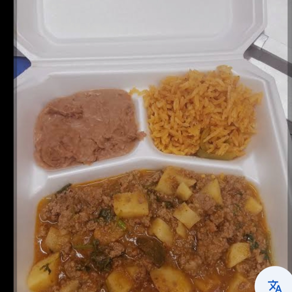 Taco de bistec ranchero con arroz y frijol