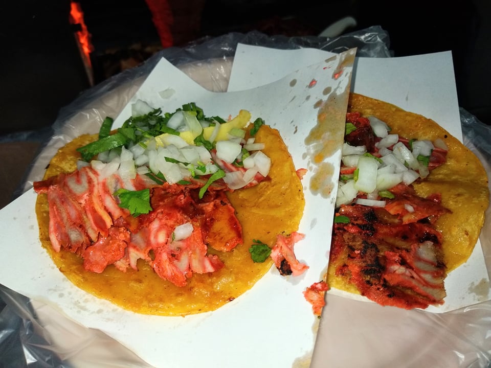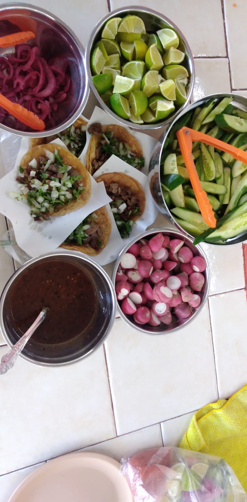 20 Tacos de adobada de maíz, se manda con todo aparte y complementos aparte salsa, pepino, chiles asados, cebollitas asadas, rabano, y limones, sujetos a existencia.
