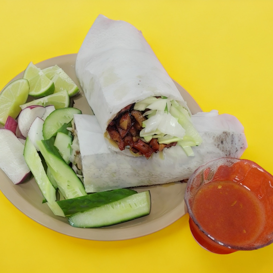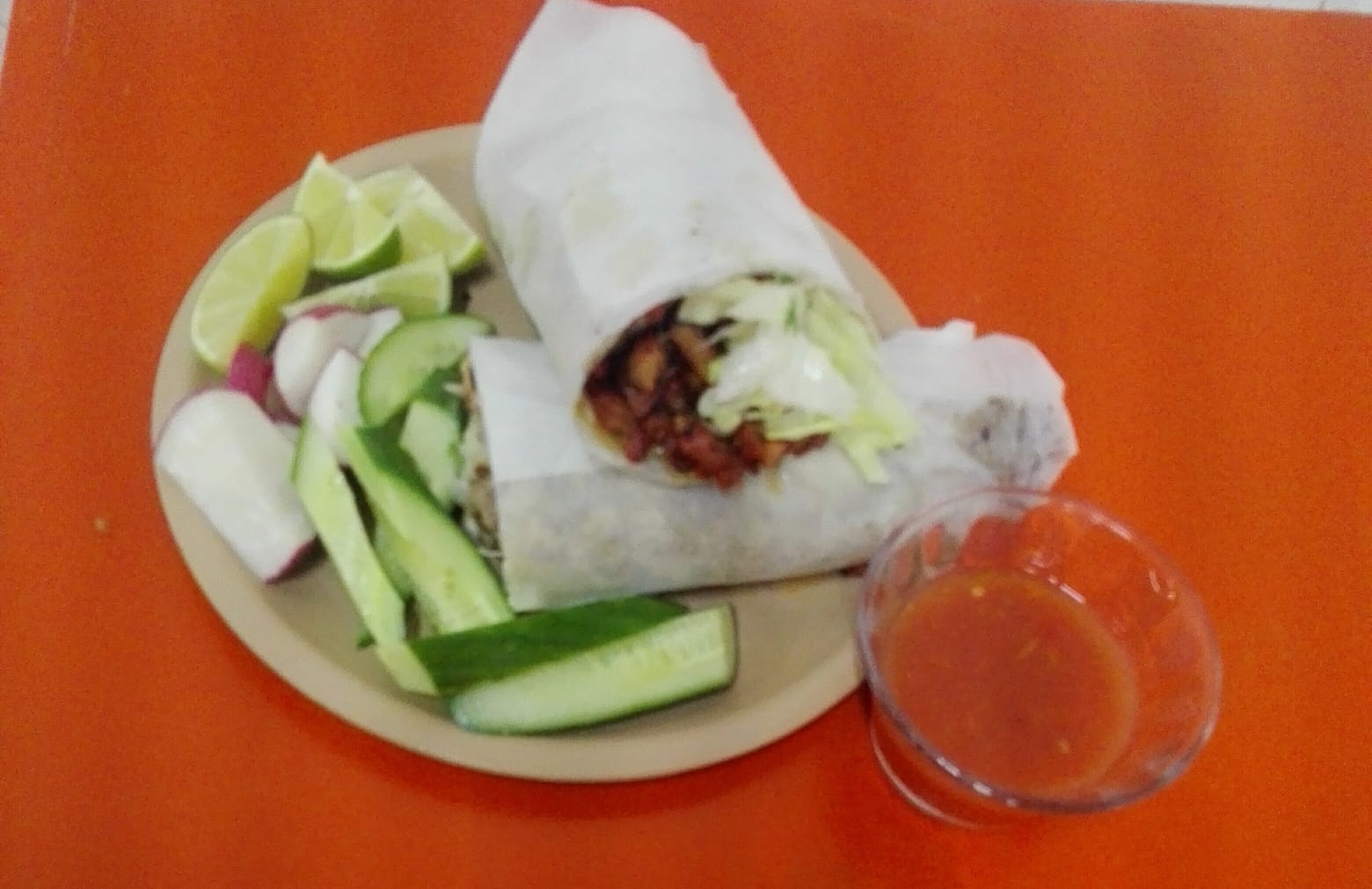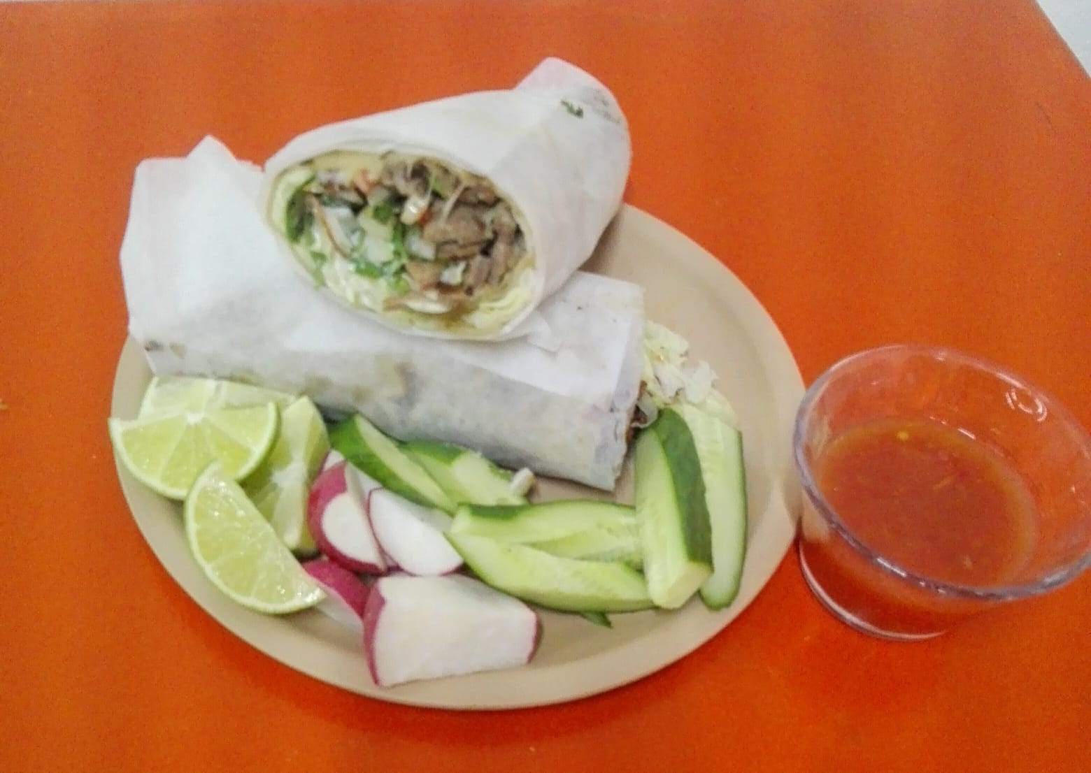 Mega burro con queso, adobada, cebolla, cilantro, lechuga, aguacate, tomate y guacamole, se manda con salsa, limones, pepino y rabanos aparte.