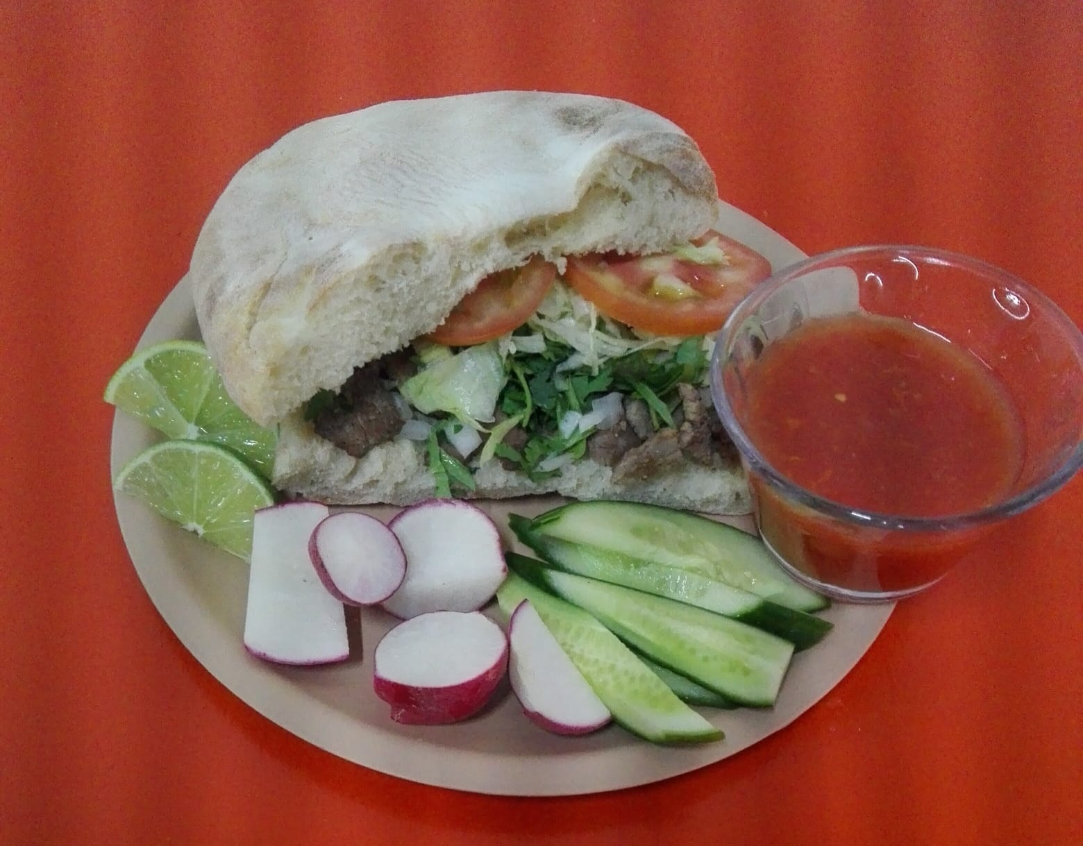 Torta de asada y adobada, con cebolla, cilantro, lechuga, tomate, guacamole, se manda con salsa, limones, pepino y rábanos aparte.