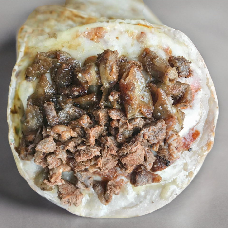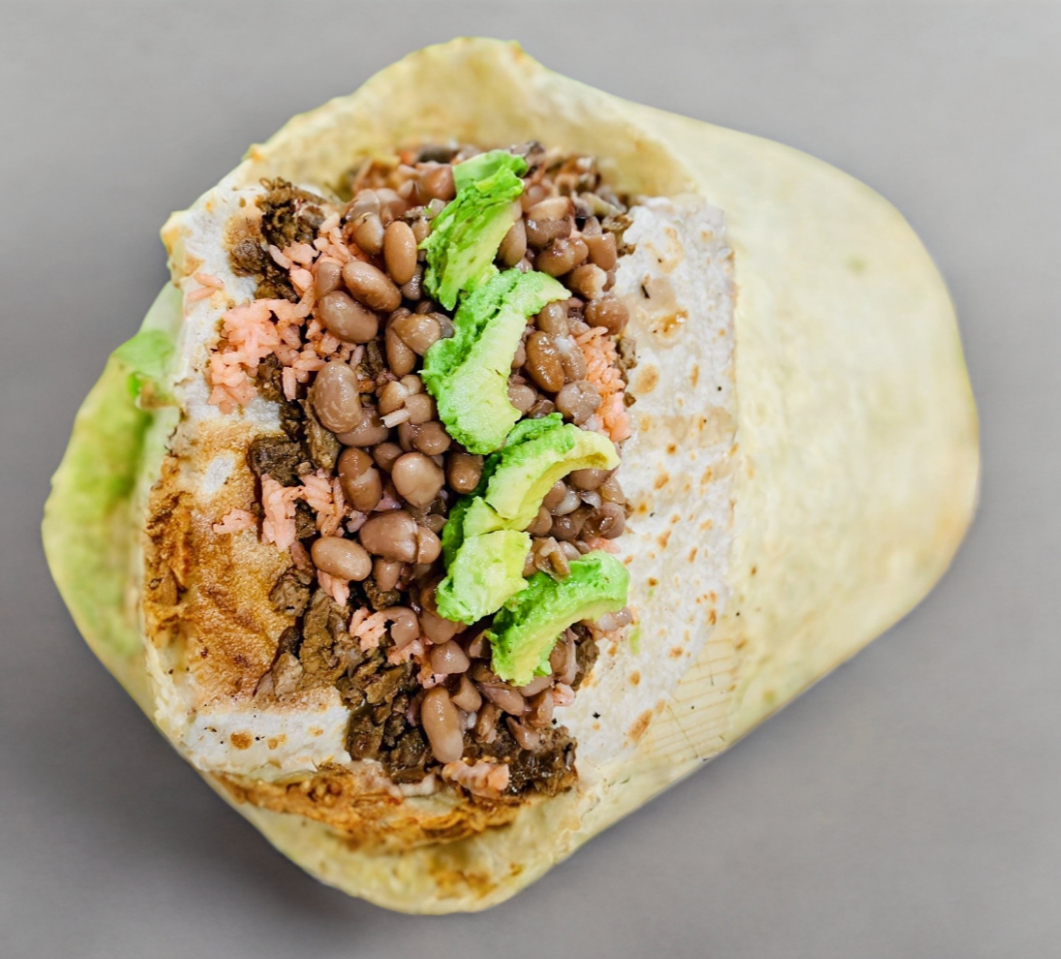 Carne asada, frijol, arroz, guacamole, salsa y en Tortilla de Harina.