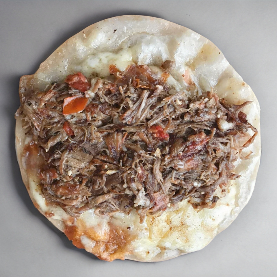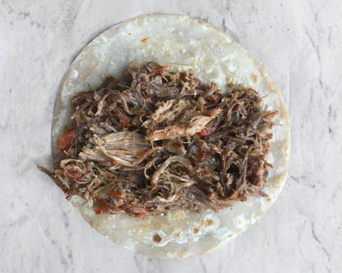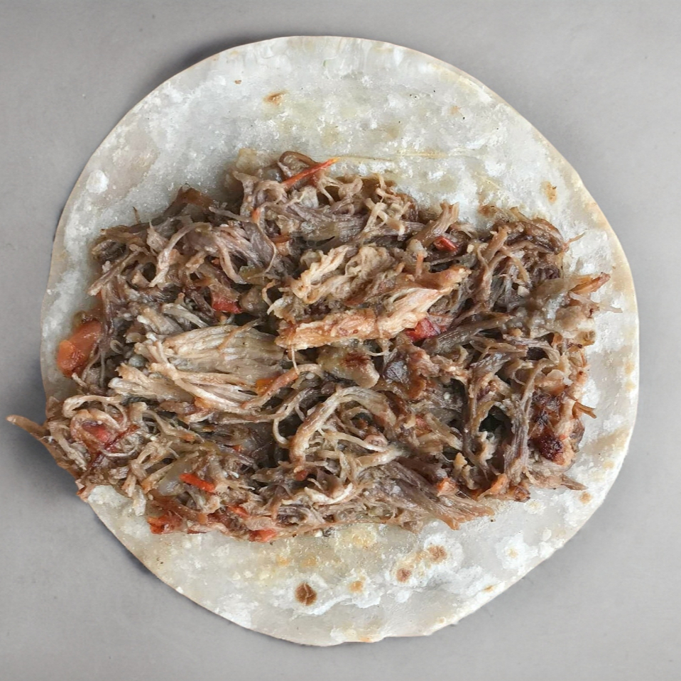 Tortilla de harina o maiz, carne deshebrada, frijol, salsa, guacamole, cilantro, cebolla, rábanos,