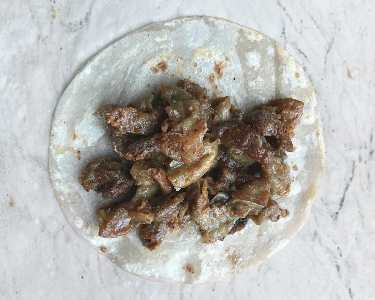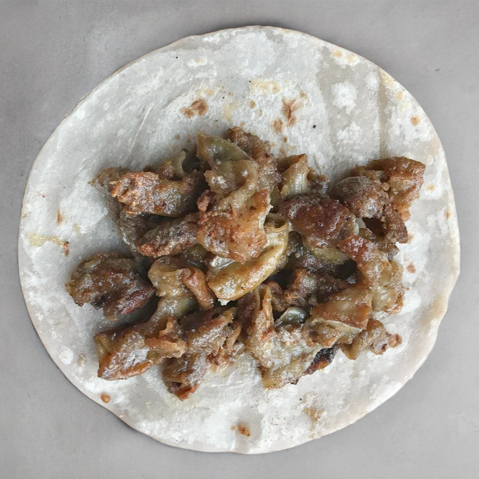 Tortilla de harina o maiz, tripa de res, queso blanco, frijol, salsa, guacamole, cilantro, cebolla, rábanos,