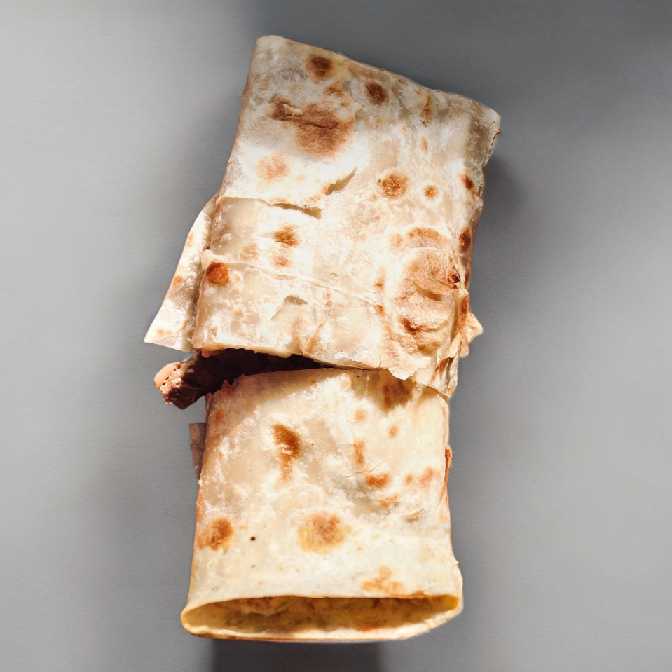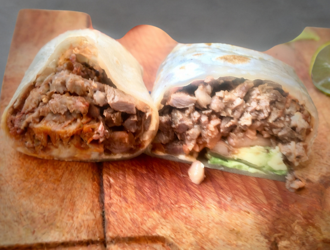 Carne deshebrada, frijol, arroz, guacamole, salsa y en Tortilla de Harina.