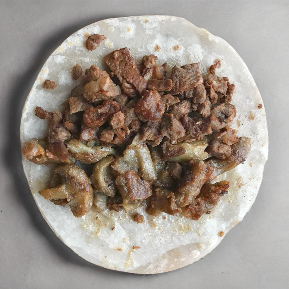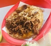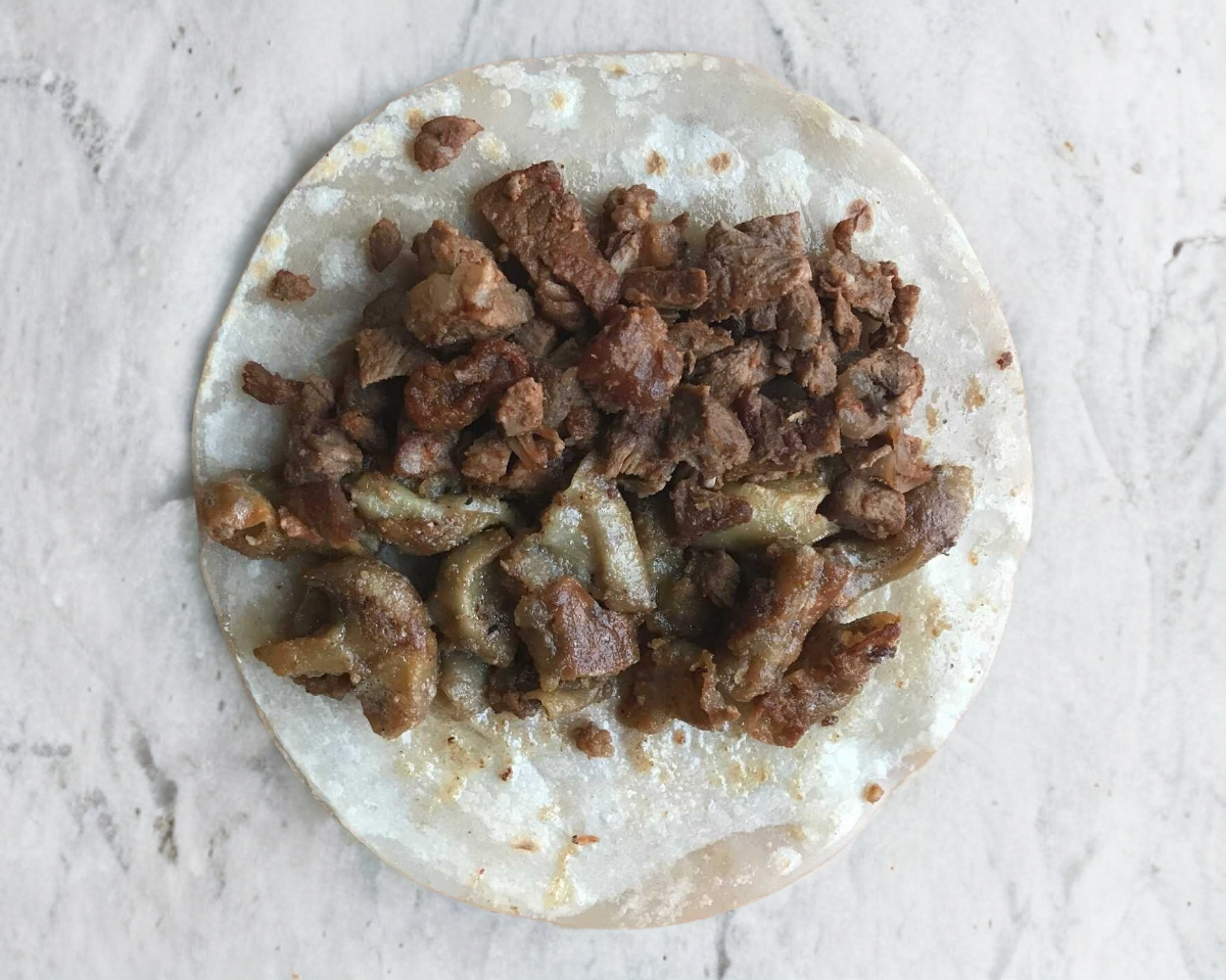 Tortilla de harina o maiz, carne asada y tripa de res, queso blanco, frijol, salsa, guacamole, cilantro, cebolla, rábanos,