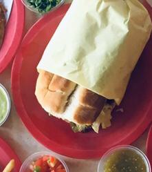 Pan telera, carne asada y tripa de res, mayonesa, margarina, aguacate, tomate, cebolla, lechuga, chiles jalapeños
