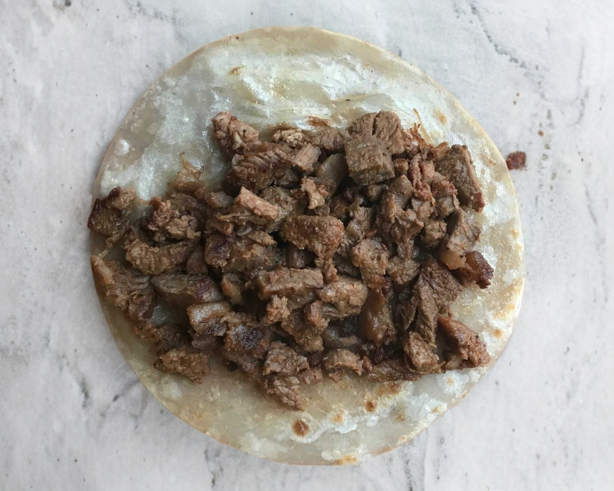 Tortilla de harina o maiz, carne asada, queso blanco, frijol, salsa, guacamole, cilantro, cebolla, rábanos,