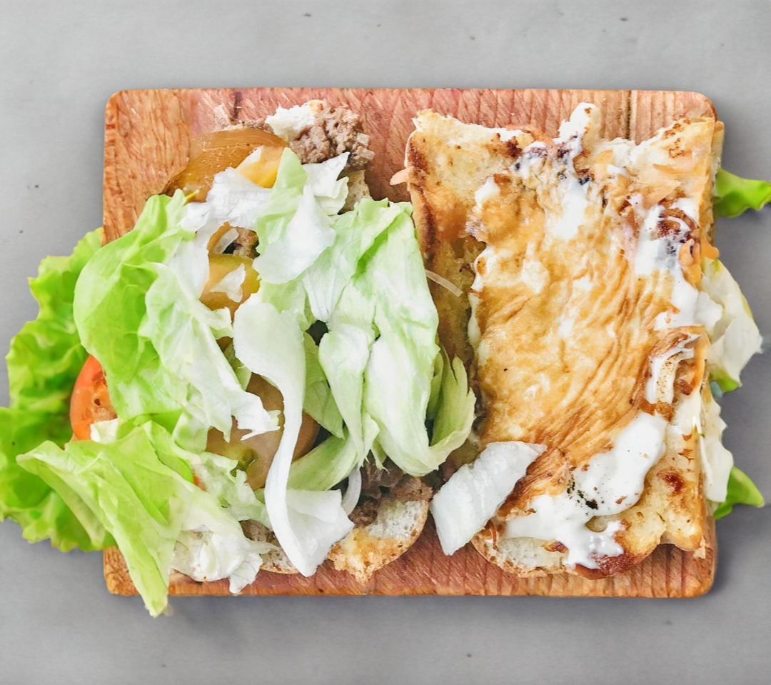 Carne, queso amarillo, pan, lechuga, cebolla, tomate, pepinillo, mayonesa, moztaza, ketchup y chiles jalapeños